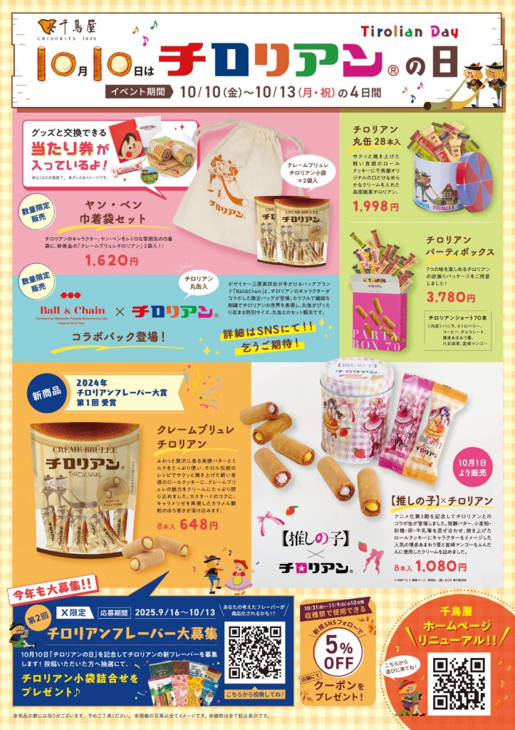 千鳥屋全店にて10月10日(金)~13日(月・祝)までチロリアンの日を記念してイベントを行っております。(一部店舗を除く)。去年チロリアンの日のフレーバーコンテスト受賞したチロリアンクレームブリュレが限定販売にてチロリアンの日より販売。またこの期間限定の商品や新しいコラボもございます。今年もフレーバーコンテストも大募集中!